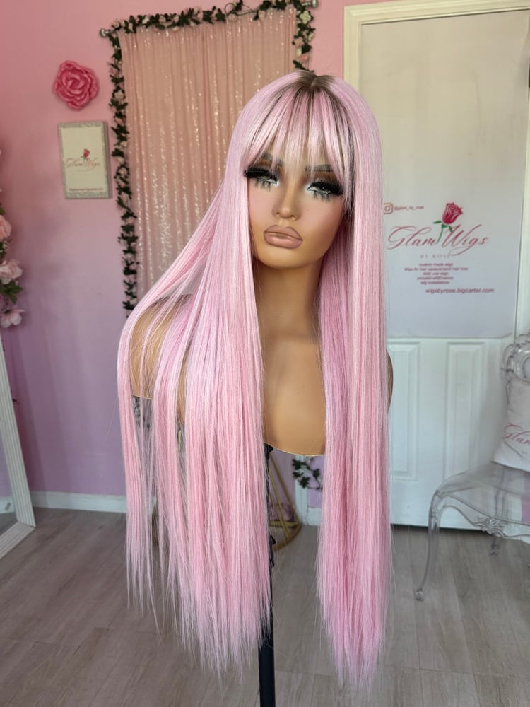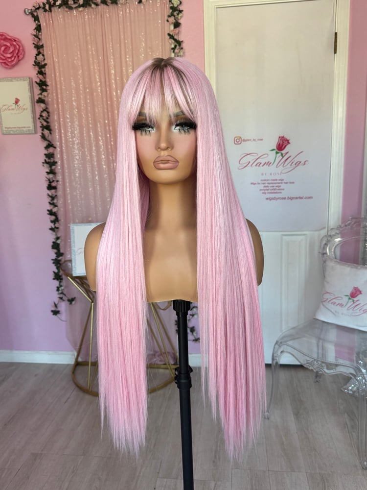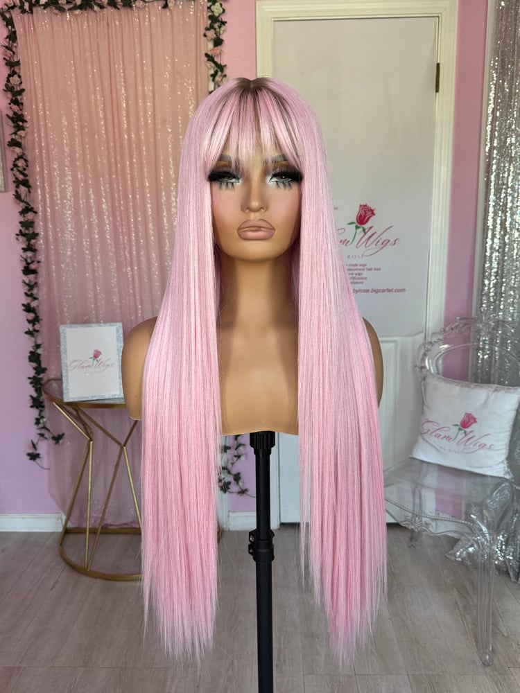 33 inch lace front t part lace glueless wig, hand painted smudge roots, human hair and synthetic blended fiber heat resistant up to 400°, stretch breathable cap, combs and adjustable straps final sale item.