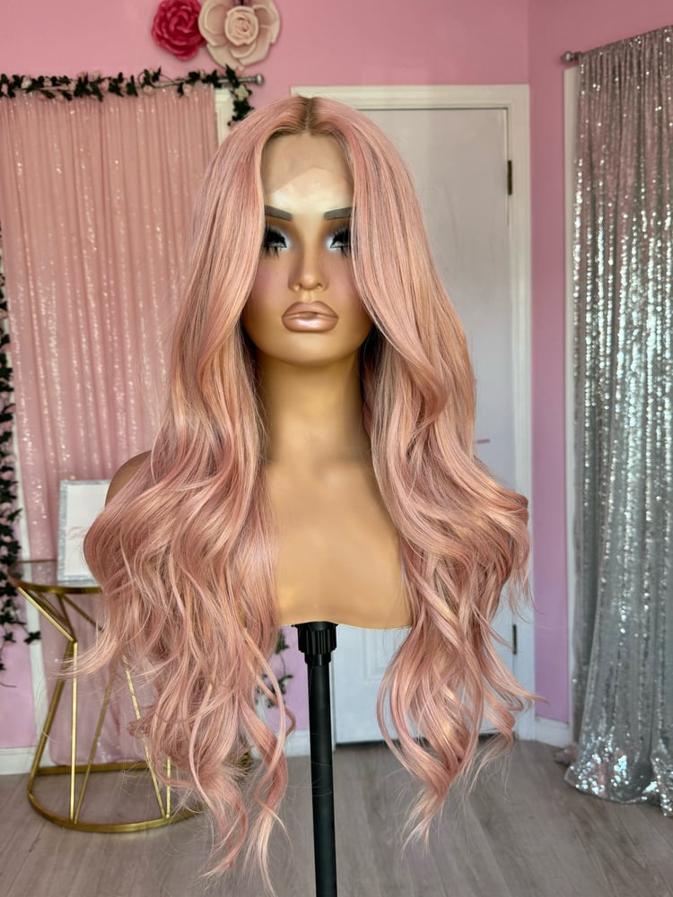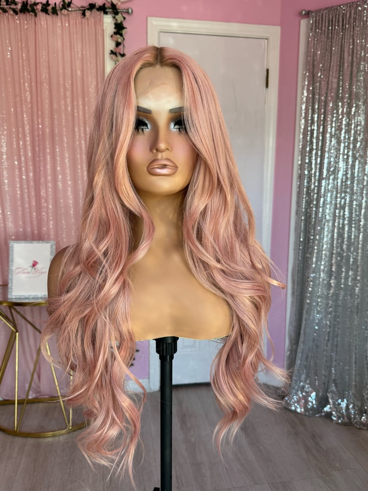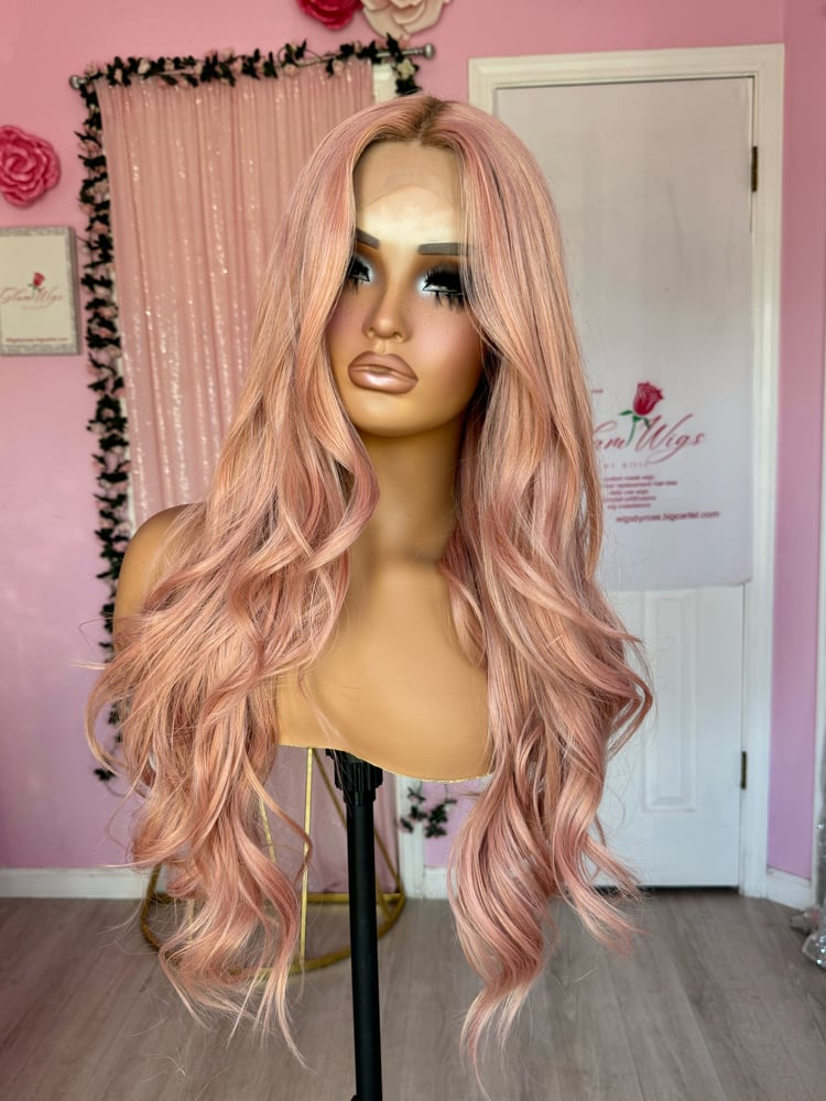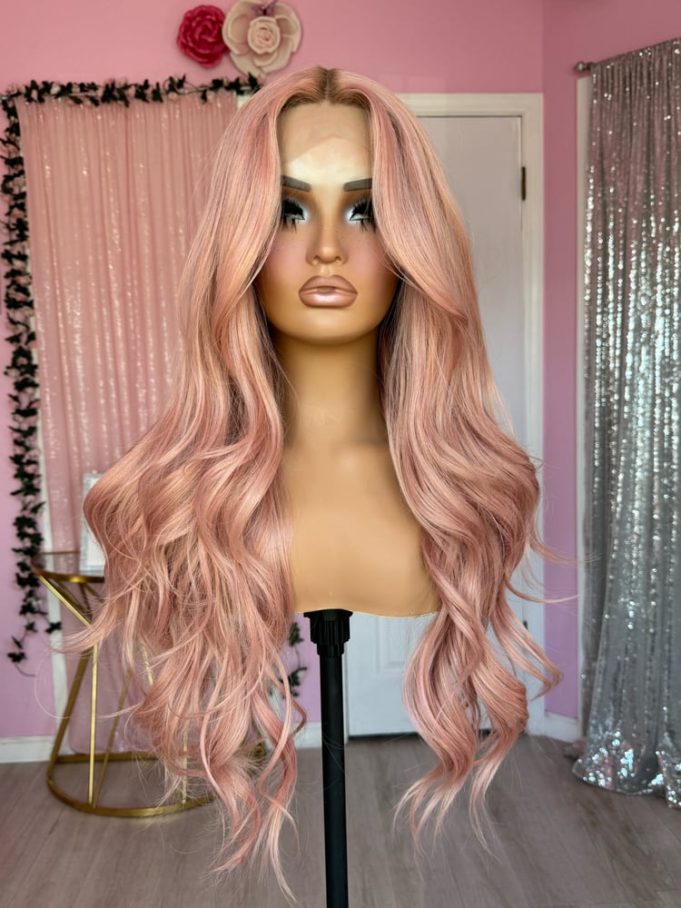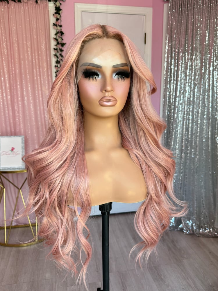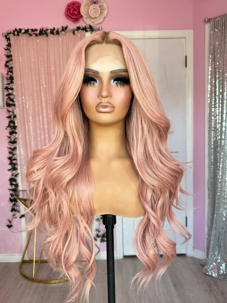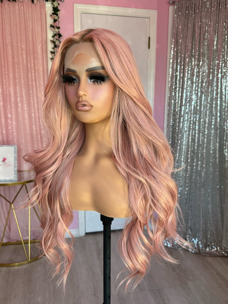 T part lace front HD lace glueless wig, heat resistant up to 350° soft silky hair textute, hand painted smudge roots, combs and adjustable straps inside 28 inch length with face framing layers, final sale item.