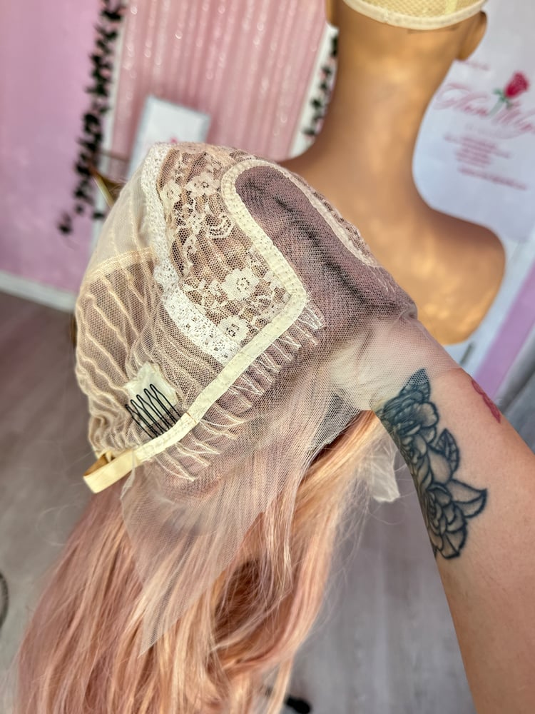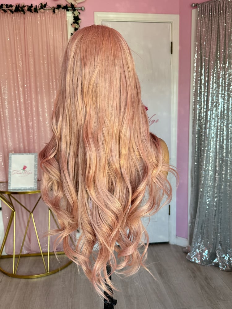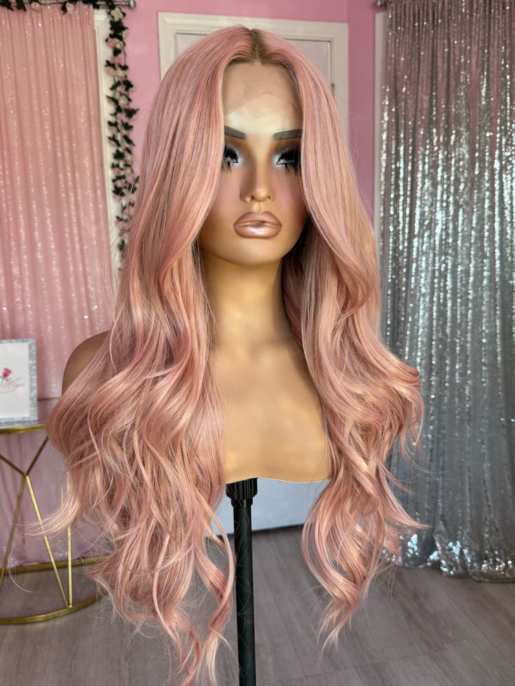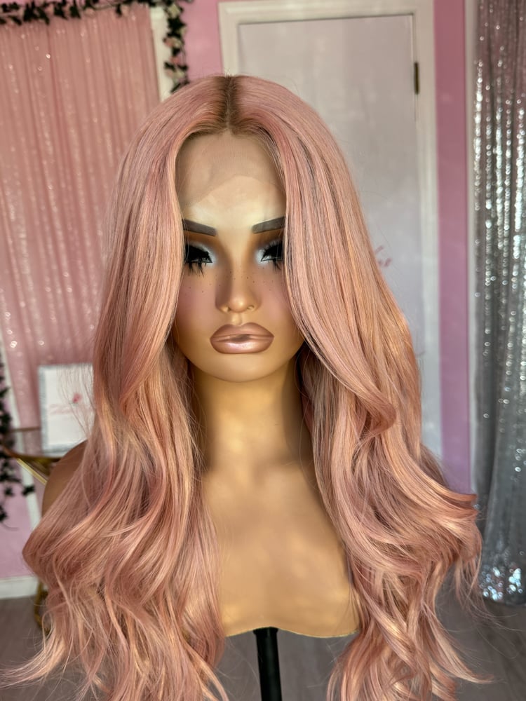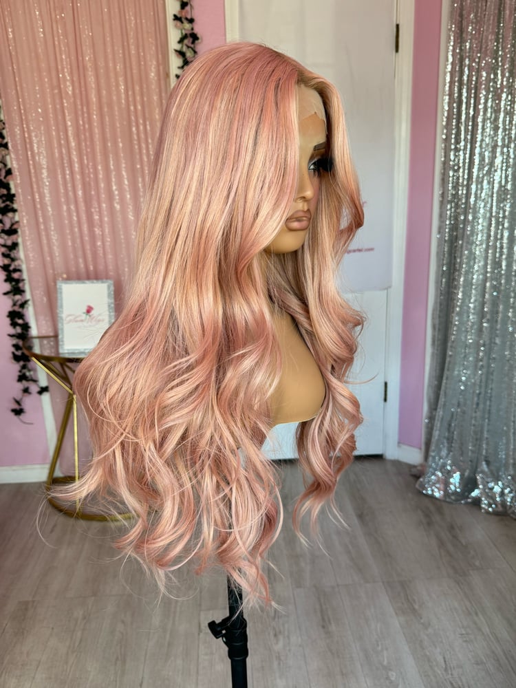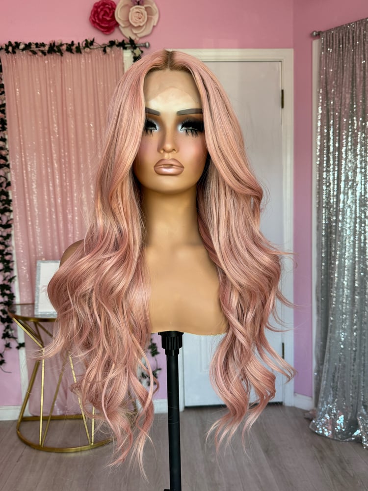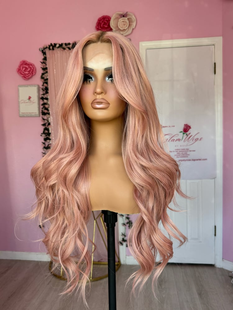 T part lace front HD lace glueless wig, heat resistant up to 350° soft silky hair textute, hand painted smudge roots, combs and adjustable straps inside 28 inch length with face framing layers, final sale item.