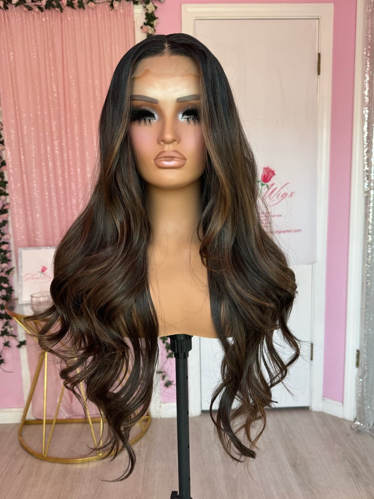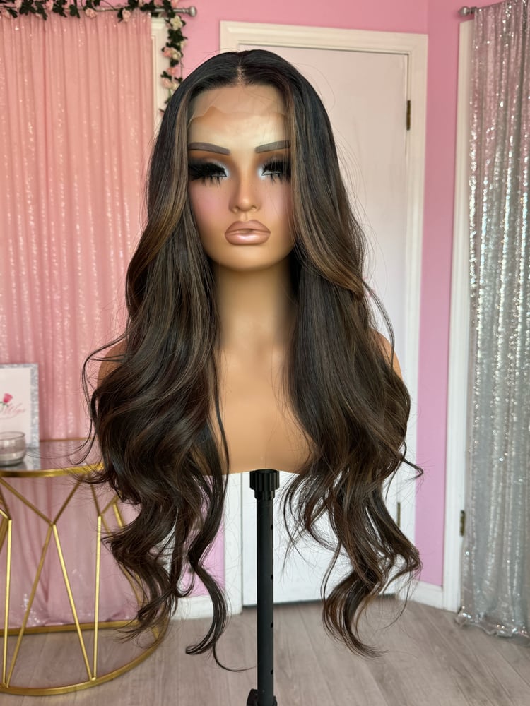 lace front 13x6 free part HD lace, glueless wig luxury synthetic Futura fiber heat resistant up to 400° heat style on 330 for best results, combs and adjustable straps inside 28 inch length with face framing layers, final sale item