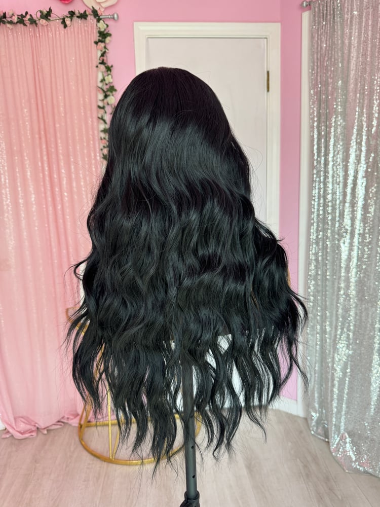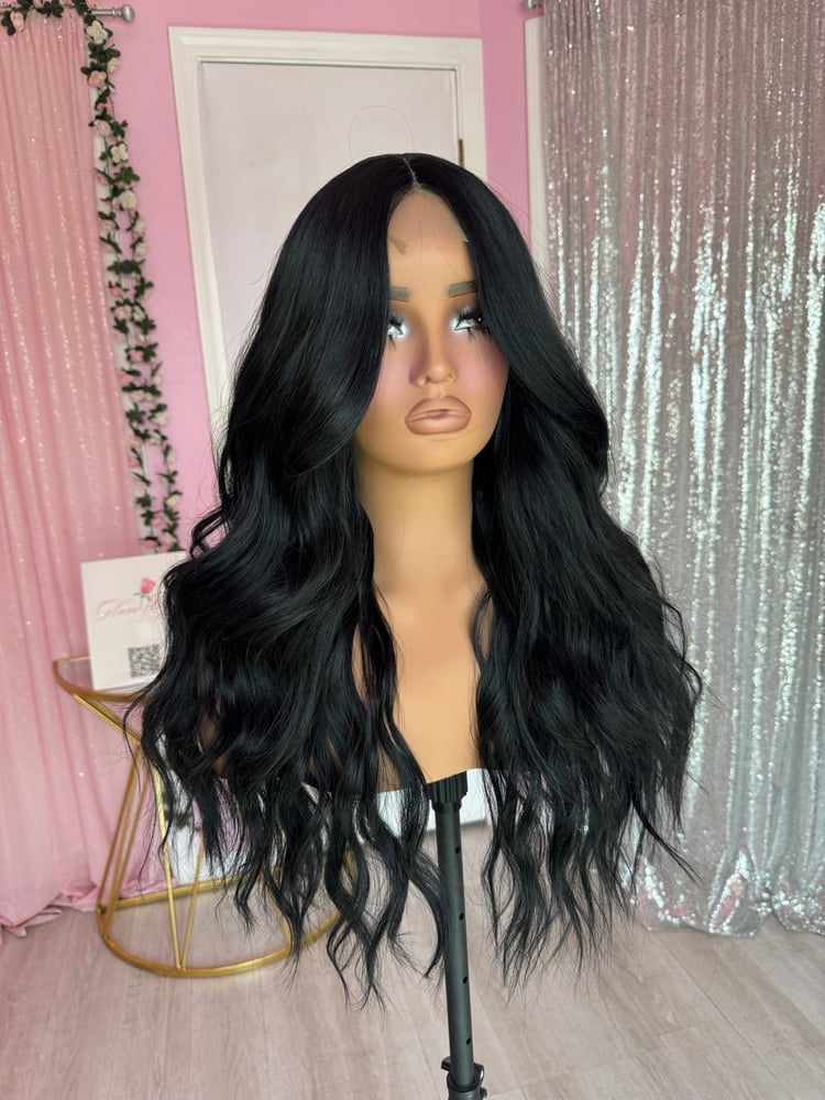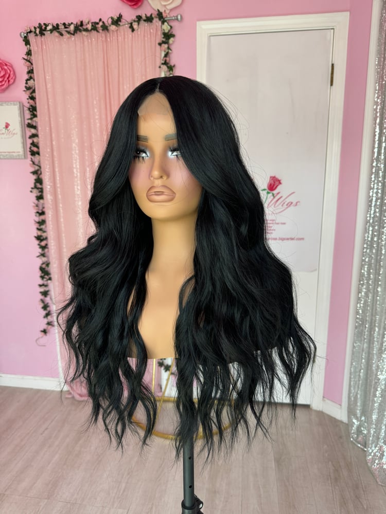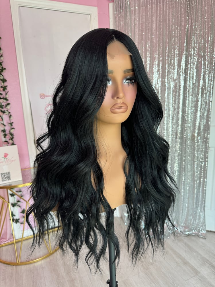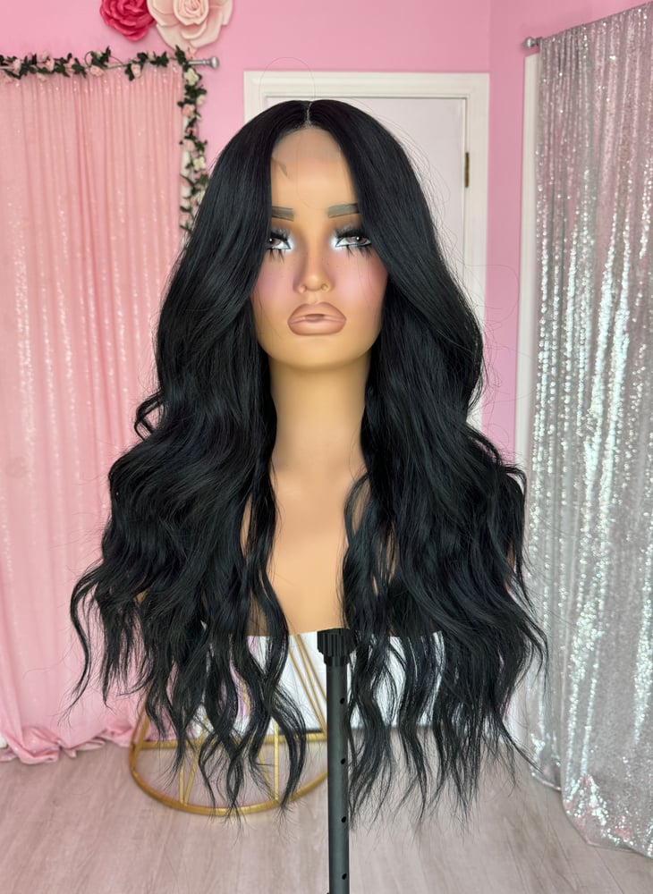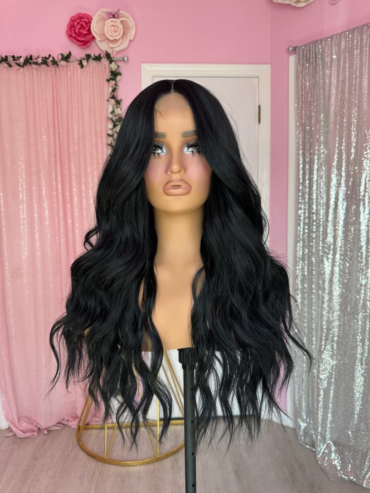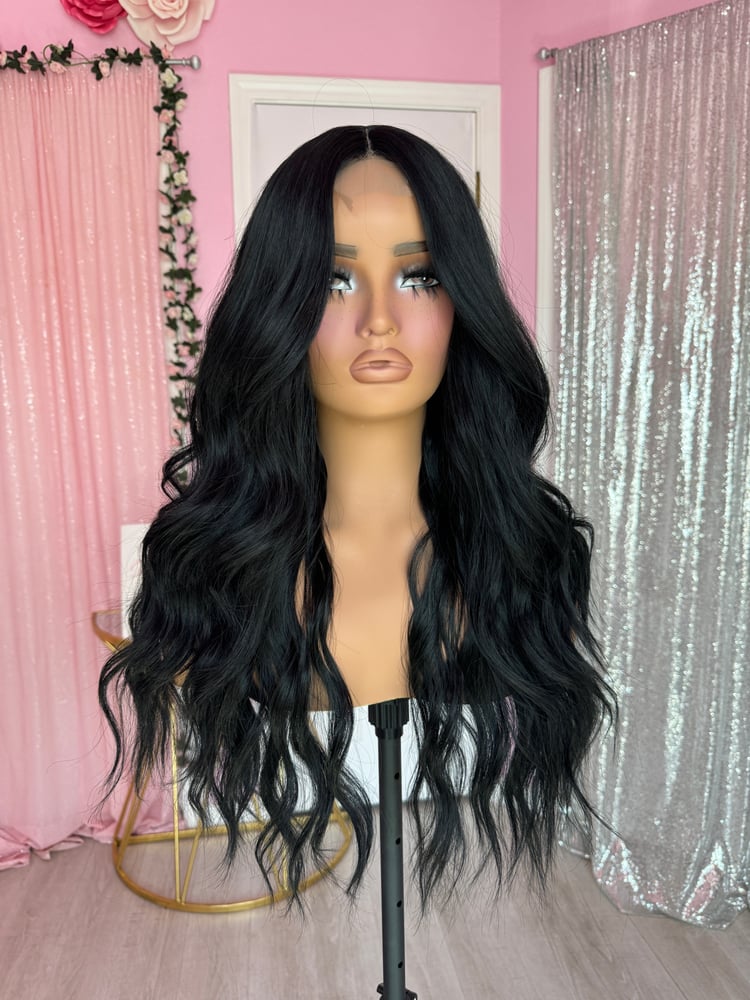 24 inch lace part glueless wig, human hair, and synthetic blend, heat resistant up to 400° natural hair texture combs and adjustable straps inside. Final sale item