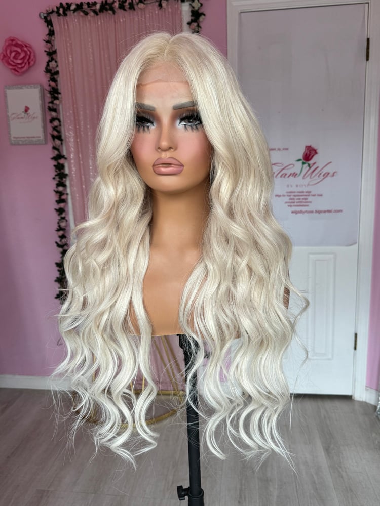 100% all human hair 13x6 lace front free part glueless wig, plucked natural hairline 210 density 30 inches long with face framing layers, combs and adjustable straps inside. final sale item