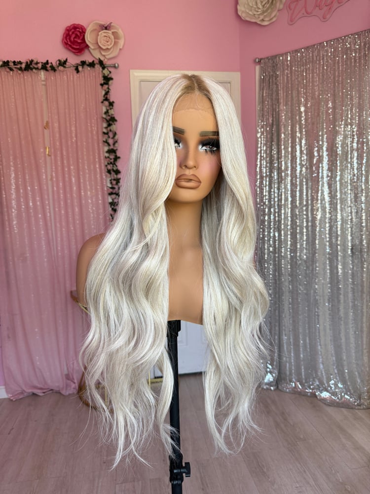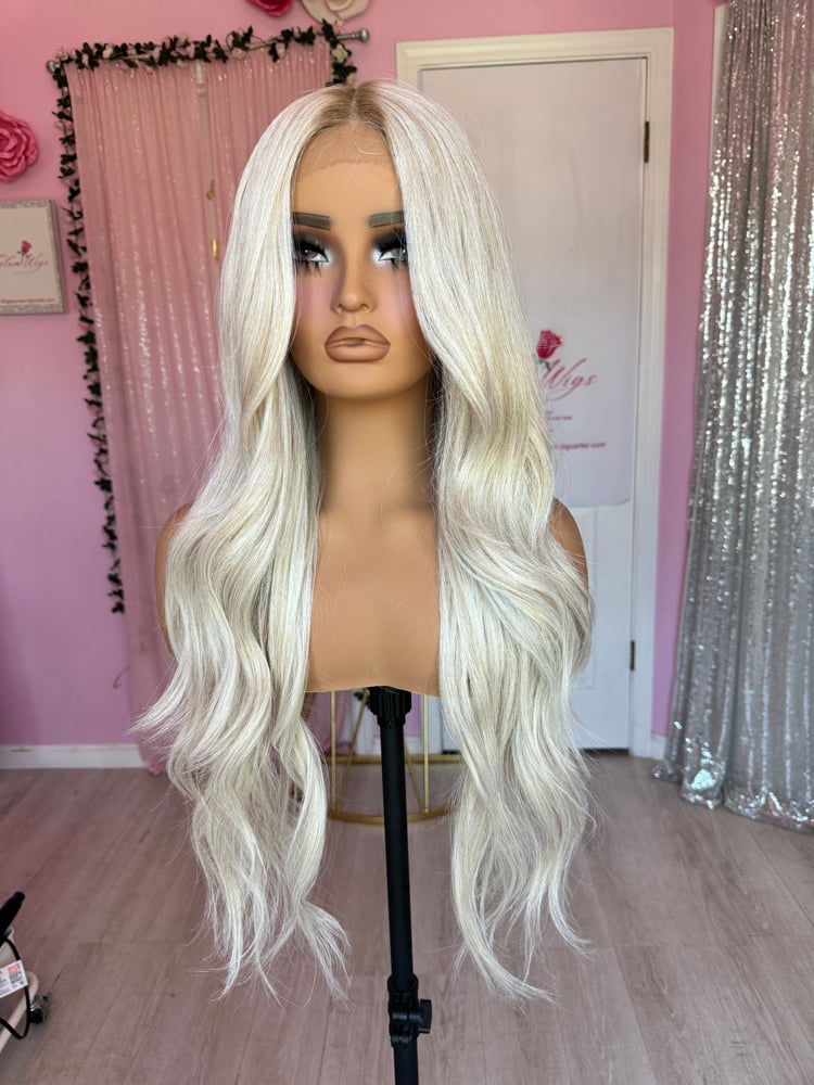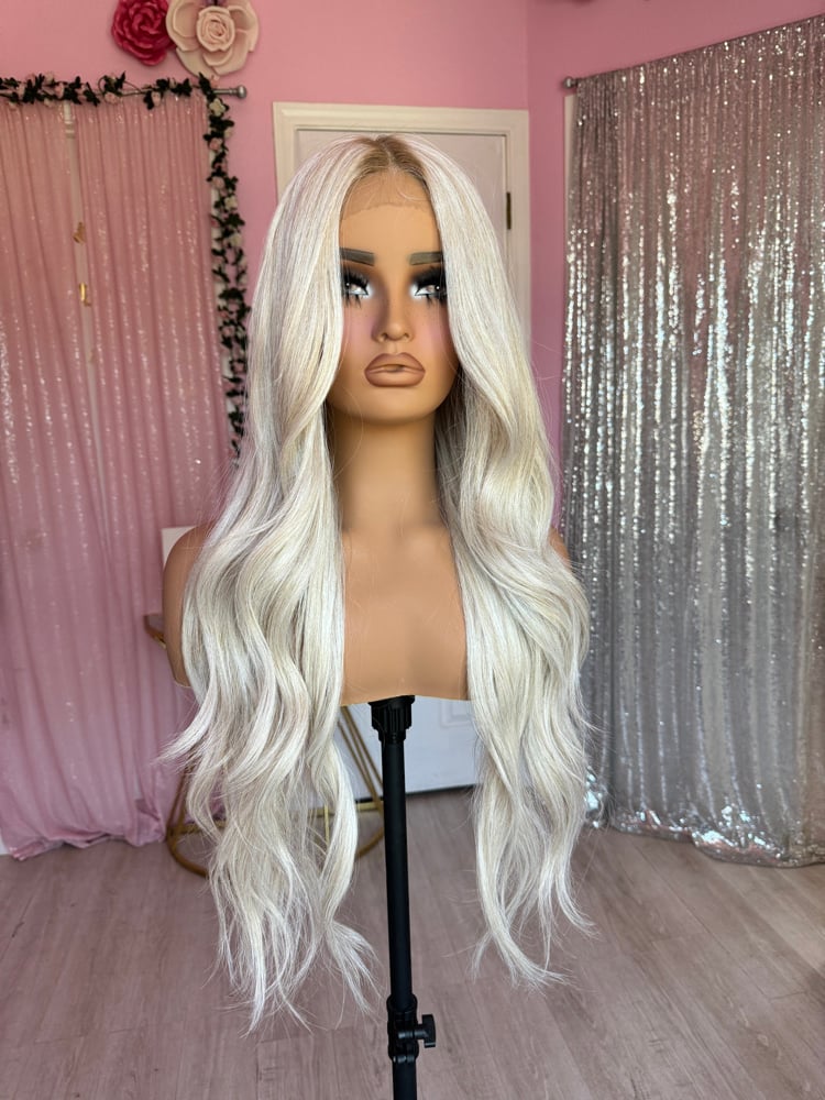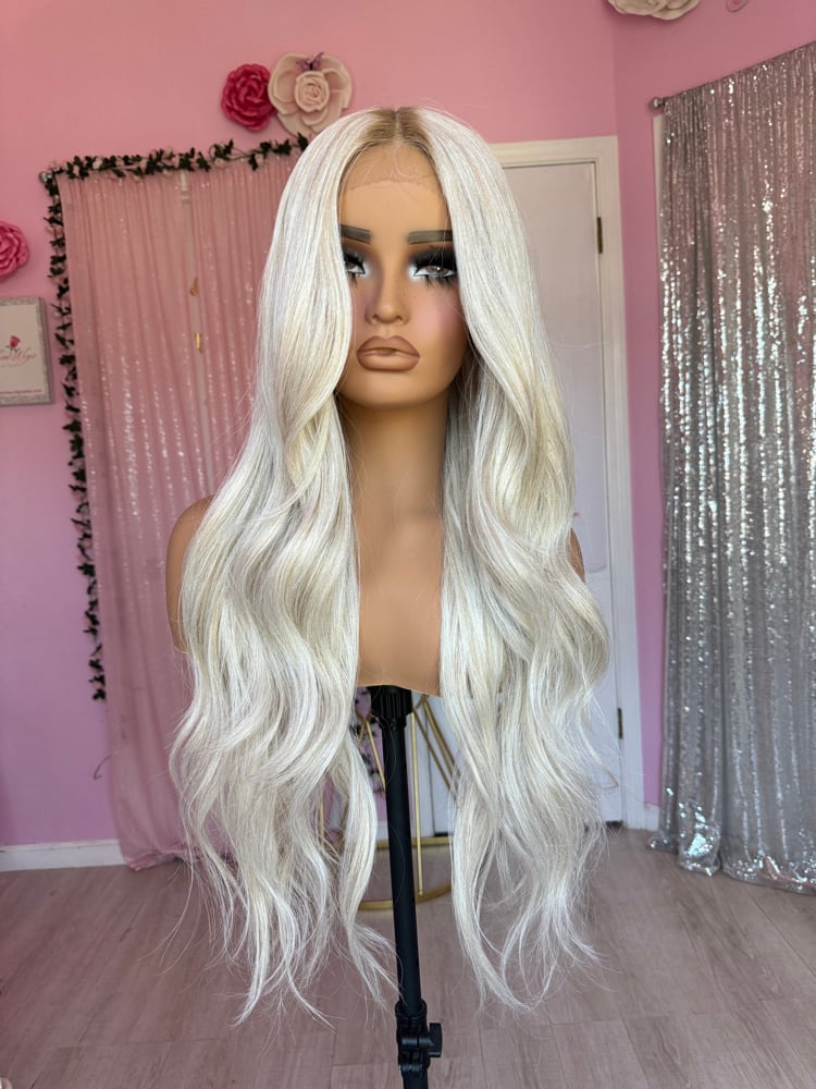 icy blonde color t part lace front glueless wig, hand painted smudge roots, combs and adjustable straps inside a stretch cap. One size fits all human hair and synthetic blended luxury fiber heat resistant up to 400° final sale item. pre-order takes about 2 to 3 week delivery