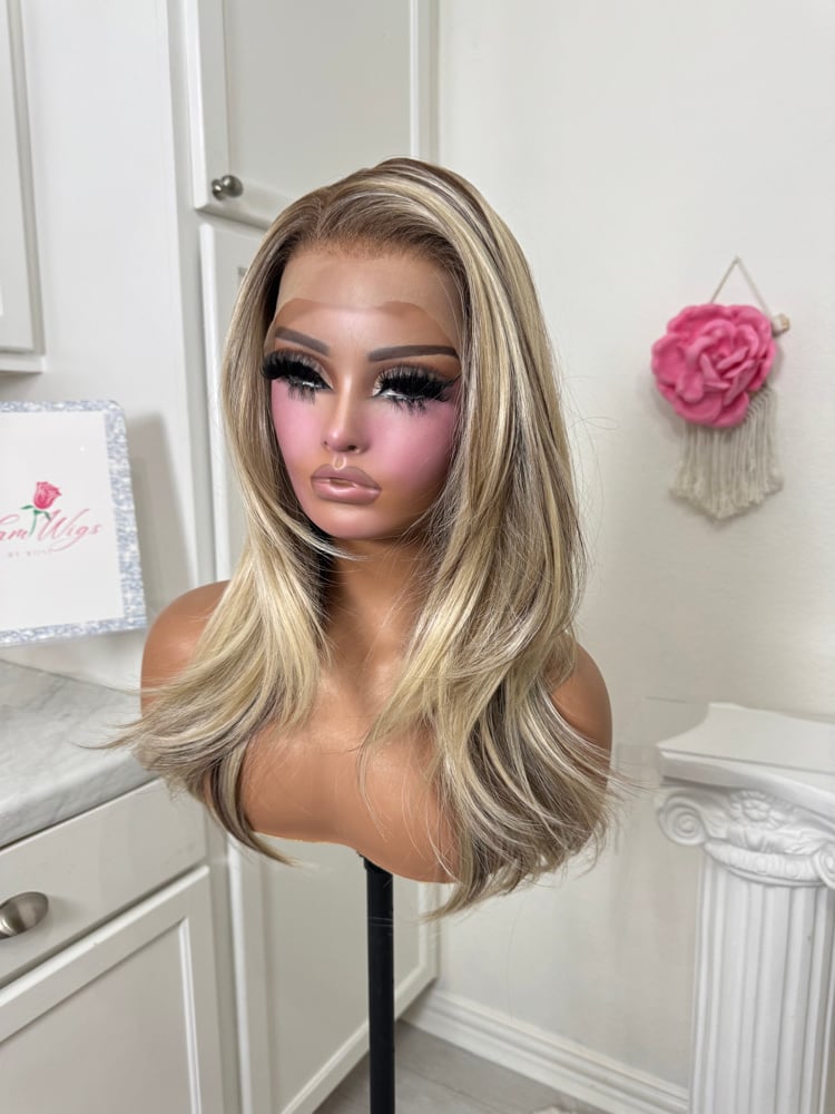 18 inches with light layers, free part 13x6 glueless lace wig, Hand plucked natural hairline, heat resistant up to 400° one size fits all stretched breathable cap with adjustable straps and combs inside. final sale item.