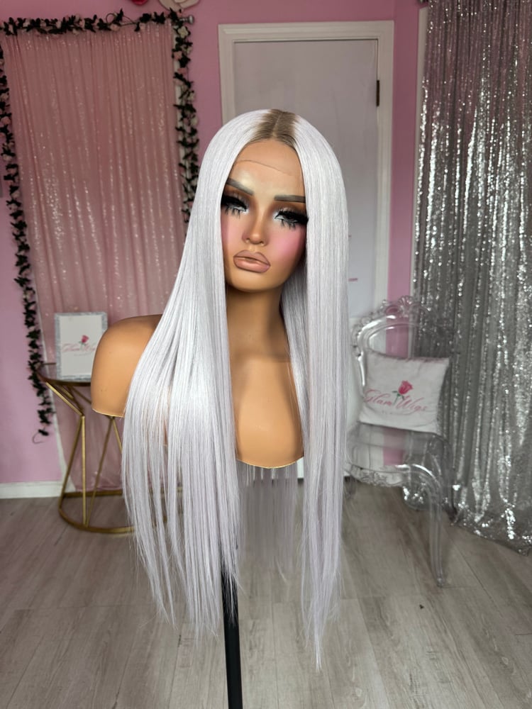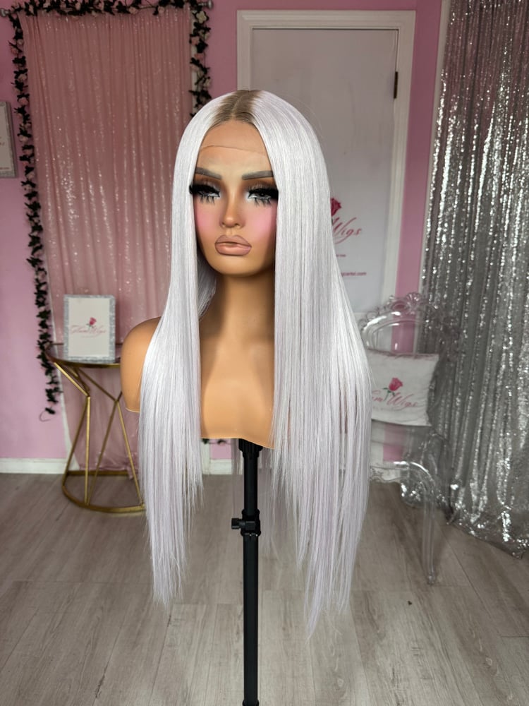 28 inches t part lace front glueless wig, synthetic and human hair blended luxury fiber heat resistant up to 400° sleek straight soft texture hair, one size fits all stretch Cap fits head circumference up to 23 inches combs and adjustable straps inside hand to paint it smudge roots, final sale item.