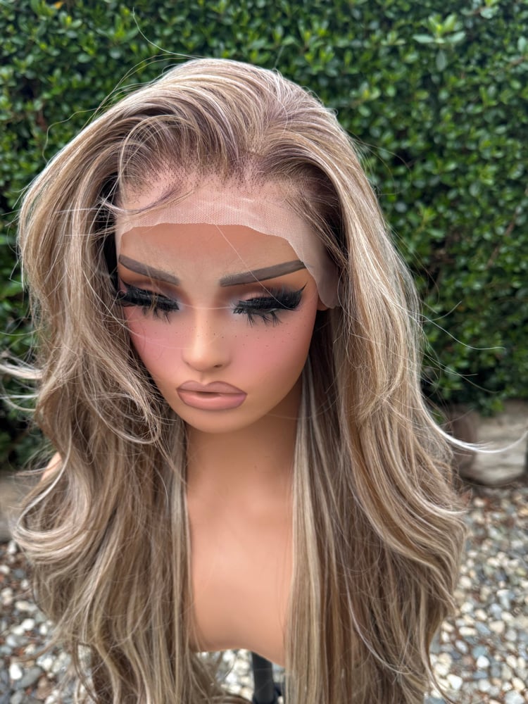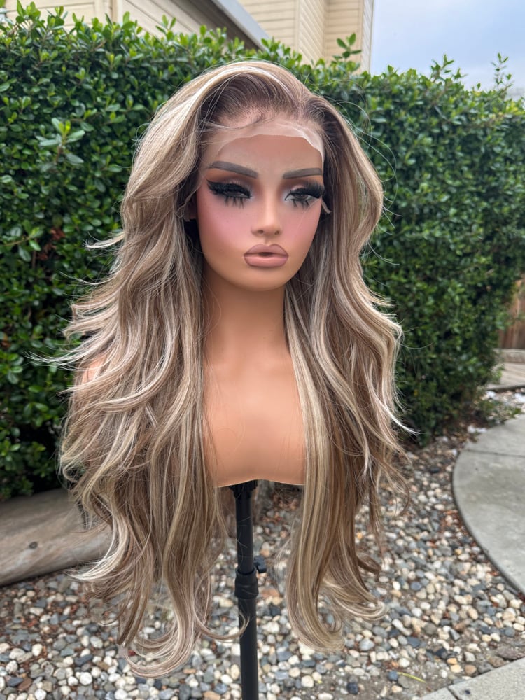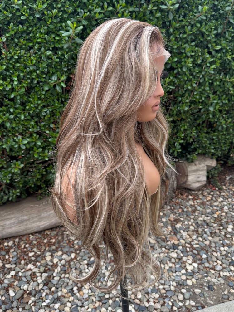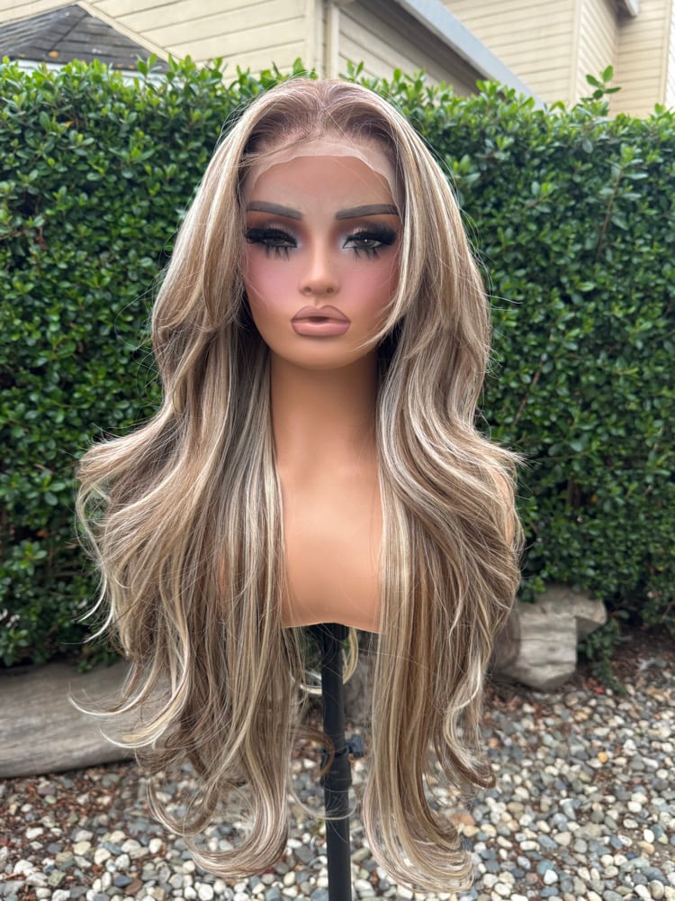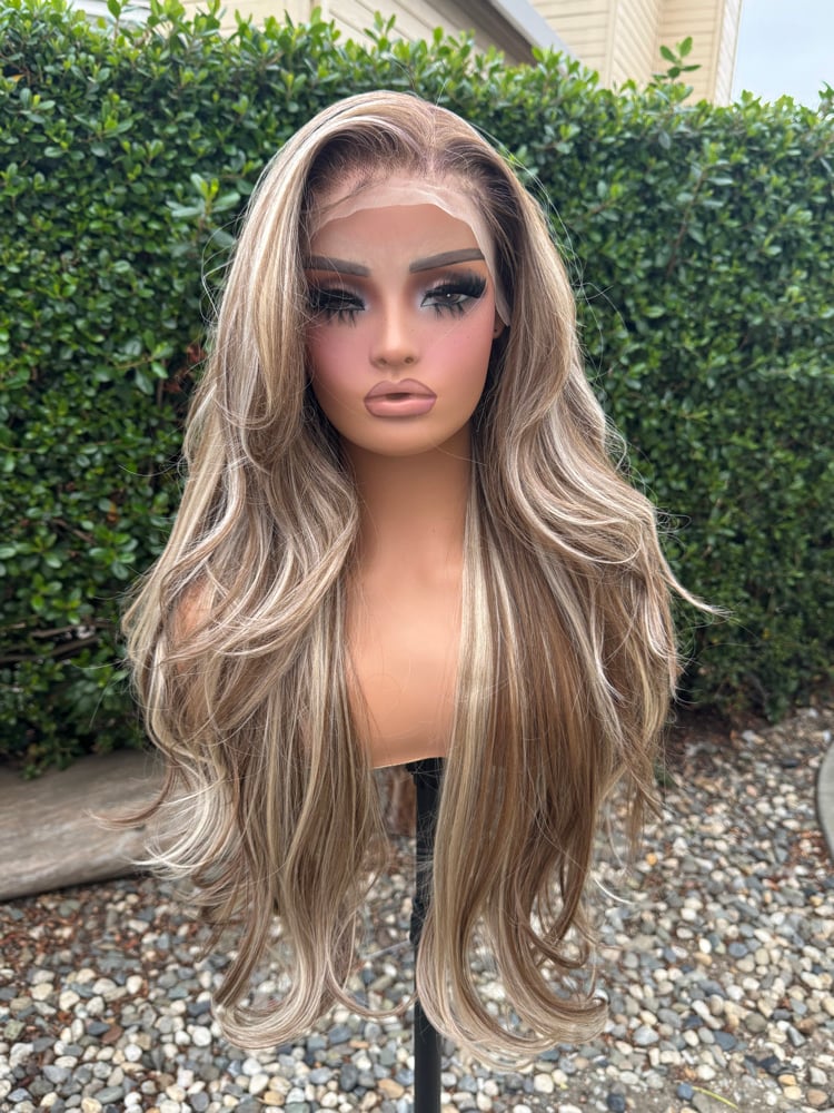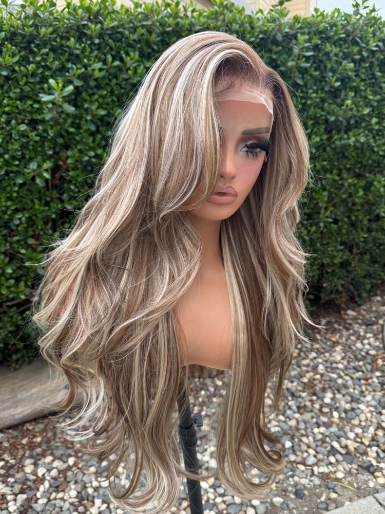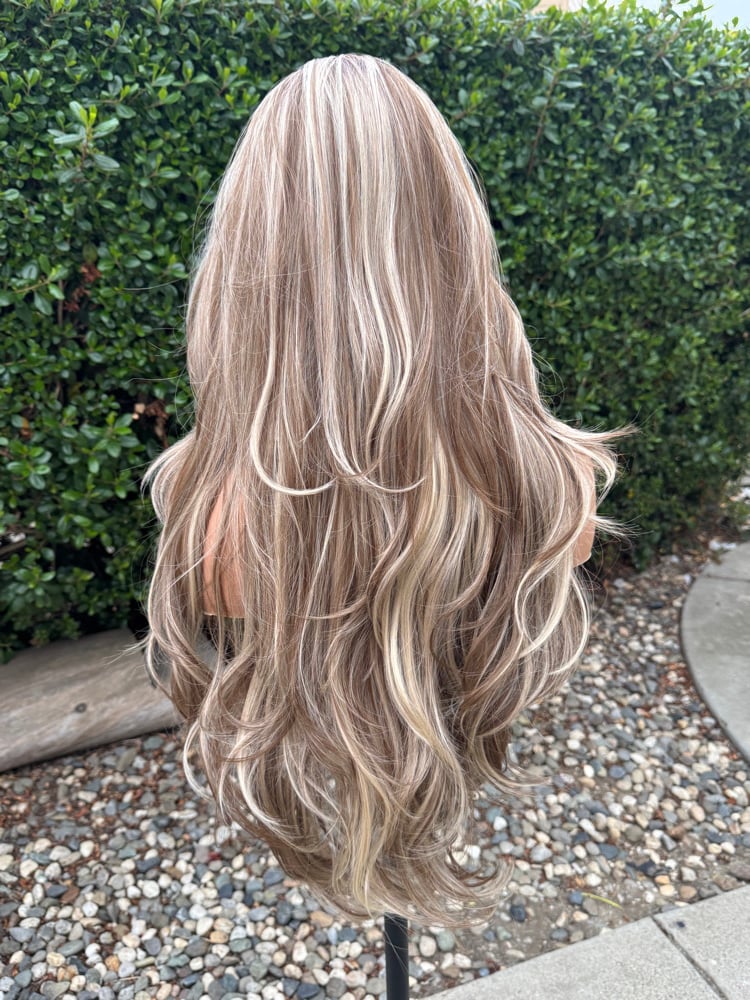Free parting 13x6 lace front glueless wig, human hair and synthetic blended luxury fiber heat resistant up to 400° soft natural hair texture combs and elastic band inside, hand painted smudge roots 30 inches with layers throughout, stretch cap final sale item