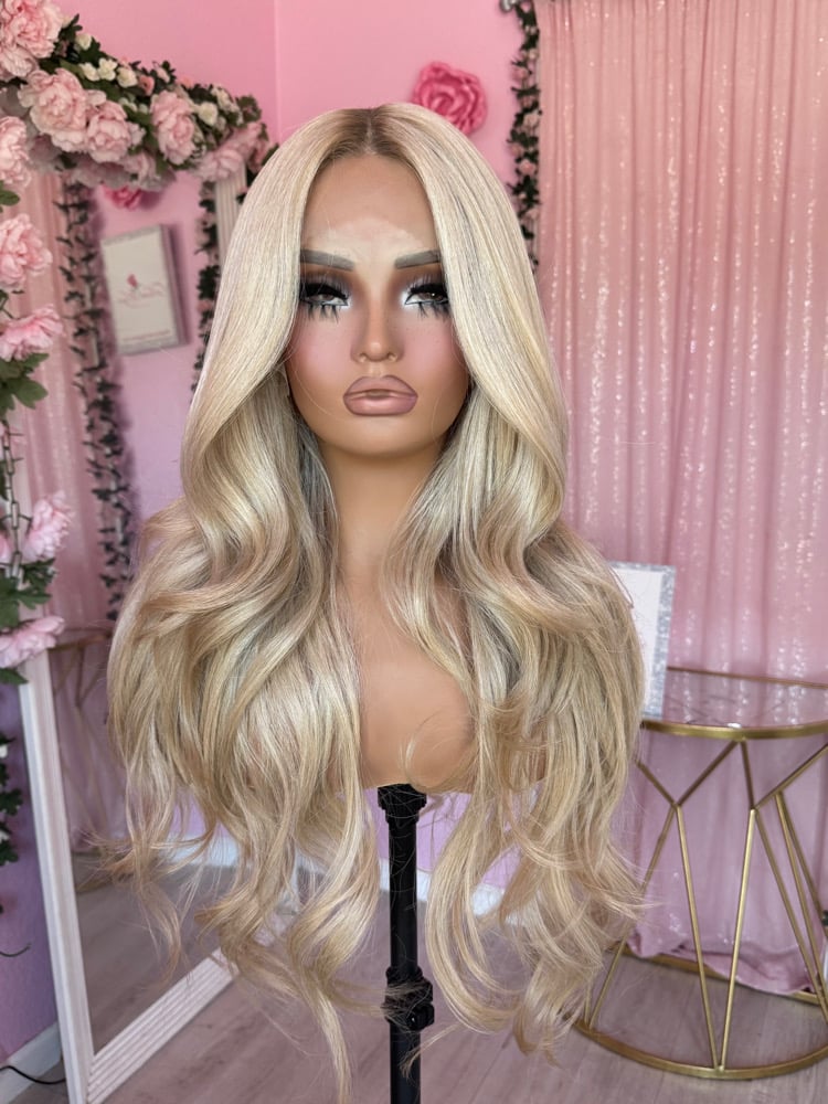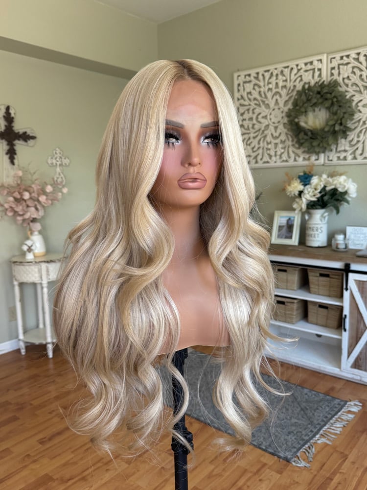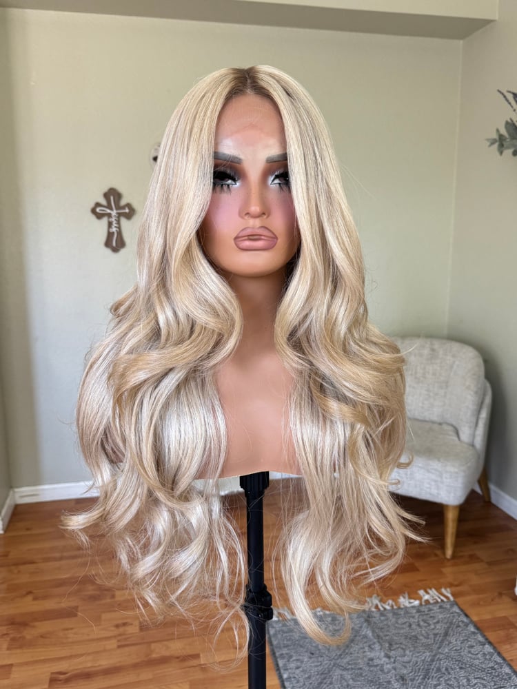 t part lace front glueless wig with hand painted smudge roots, 28 inches with layers human hair and synthetic blended luxury fiber heat resistant up to 400° refer to card that comes with your order for heat styling and care Instructions, stretch cap combs and adjustable straps.