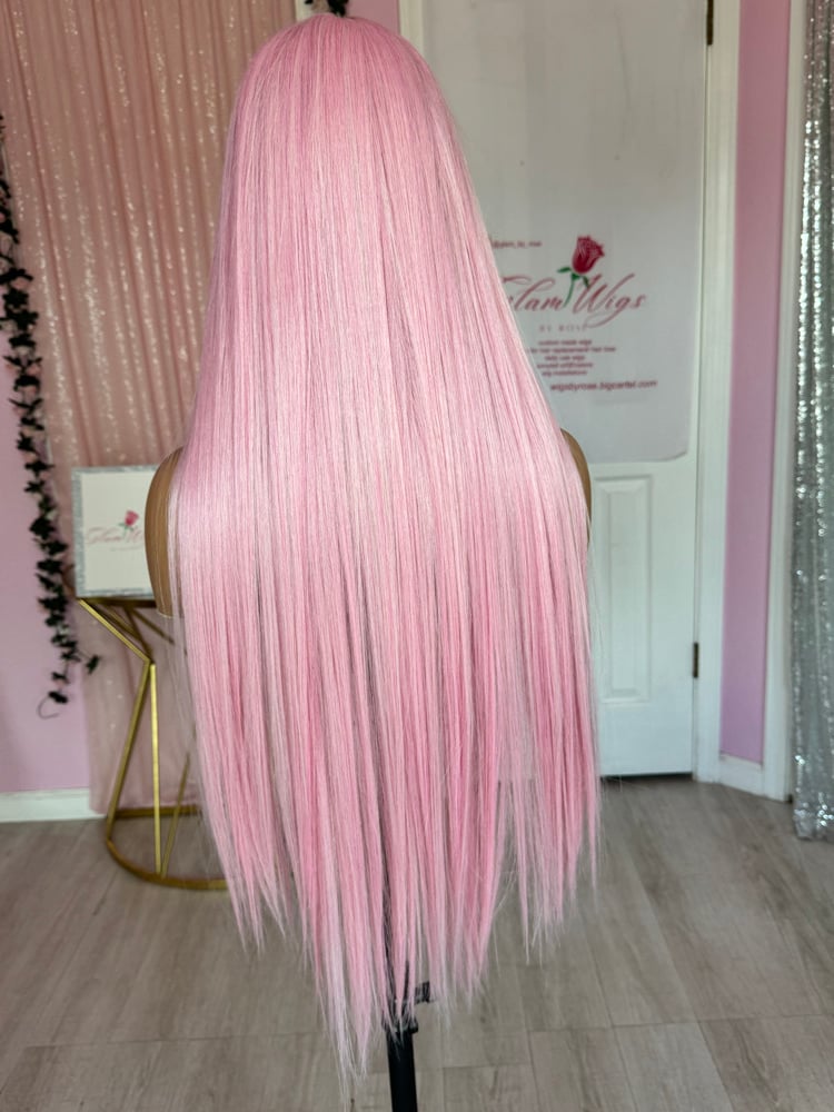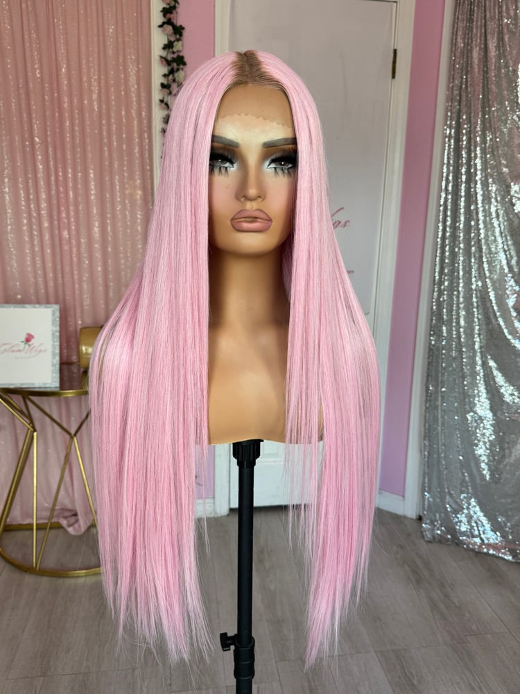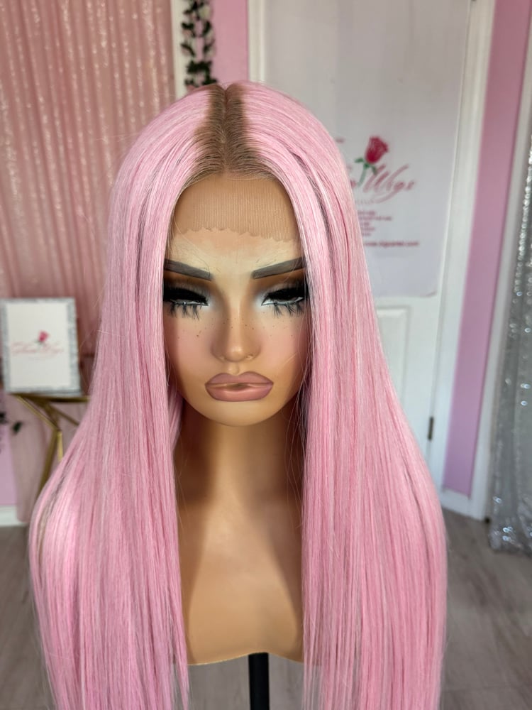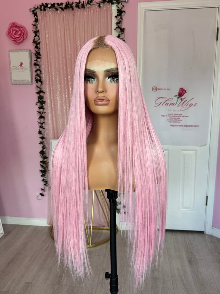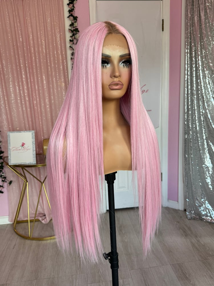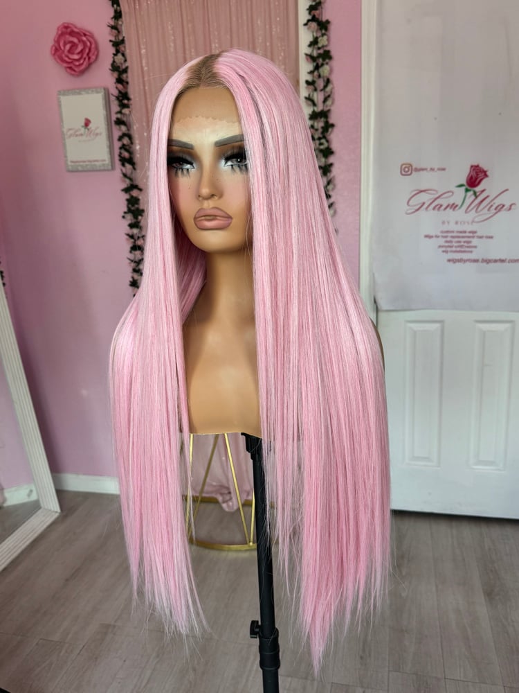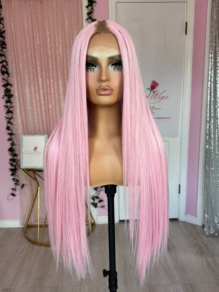 32 inches lace front t part lace glueless wig with hand painted smudge roots, soft luxury human hair and synthetic blended fiber for most realistic texture, heat resistant up to 400° combs and adjustable straps inside final sale item