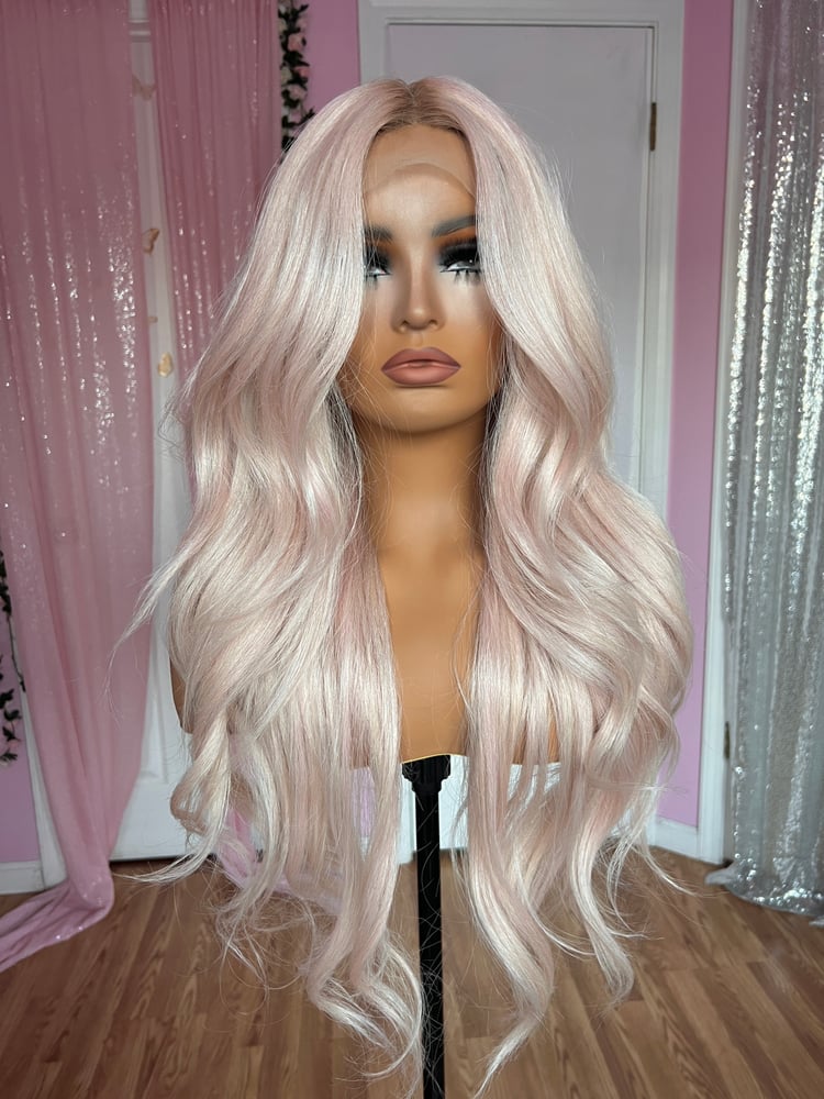Lace front 28 inch t part luxury glueless wig blended synthetic and human hair most natural texture, HD lace with shadow roots. no glue needed combs and adjustable straps one size fits all, final sale item